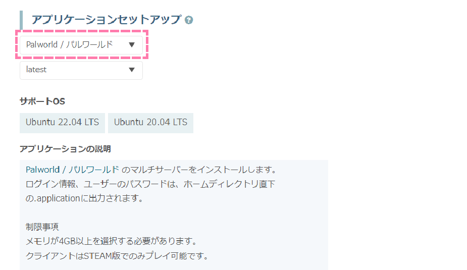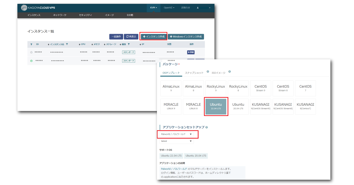 インスタンス作成画面でOSに「Ubuntu24.04」もしくは「Ubuntu22.04」を選択し、アプリケーションセットアップは「Palworld/パルワールド」を選択し、サーバーを作成します。